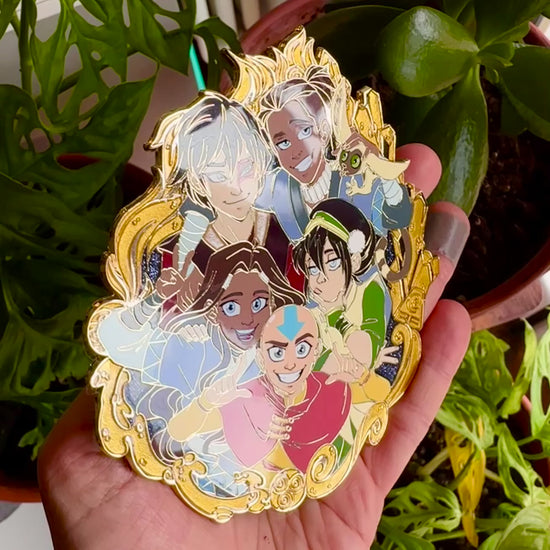 LE75, 5 inches (12,7 cm) tall golden plated pin with glitter, raised metal areas, sandblast, pearl no swirls and screen-printed details.