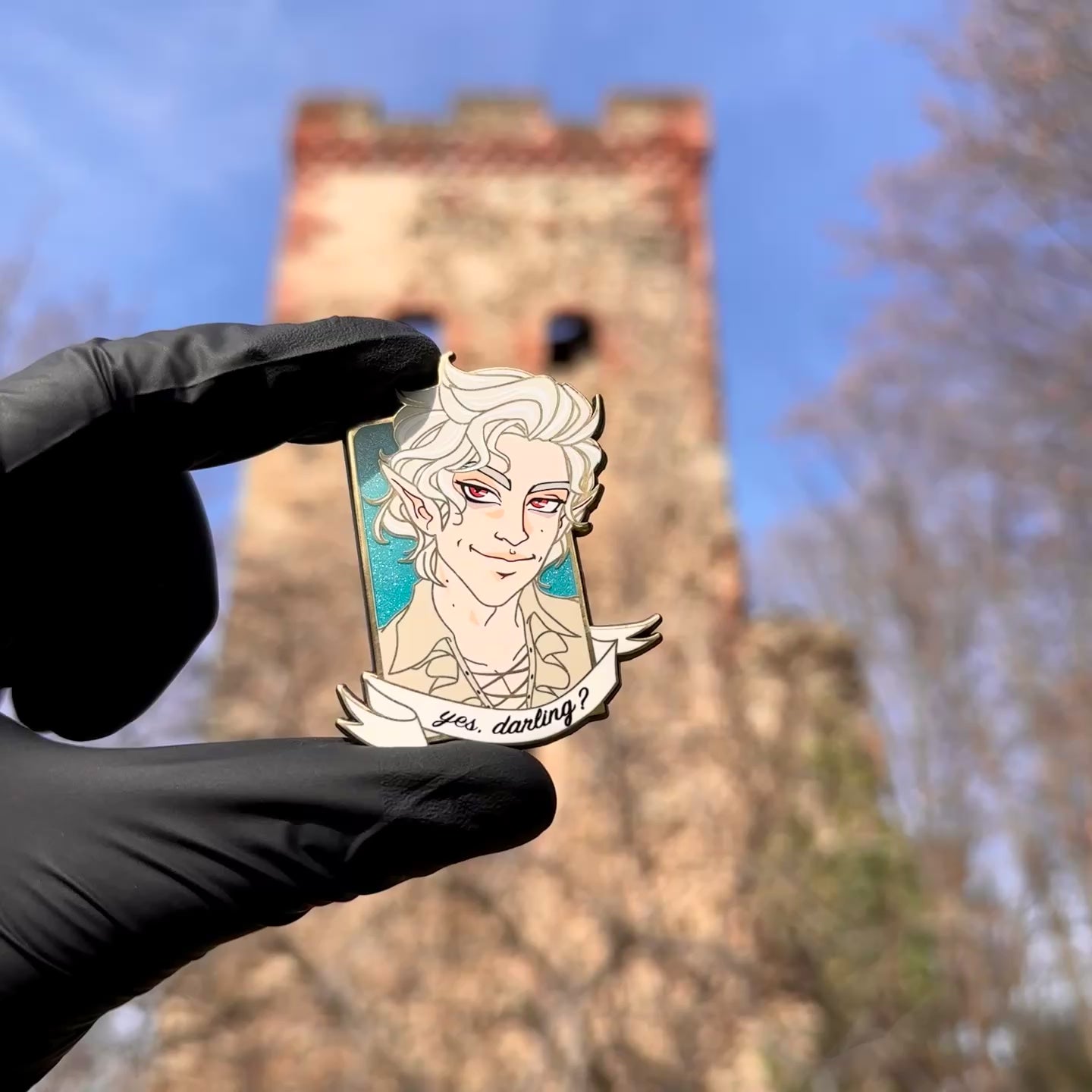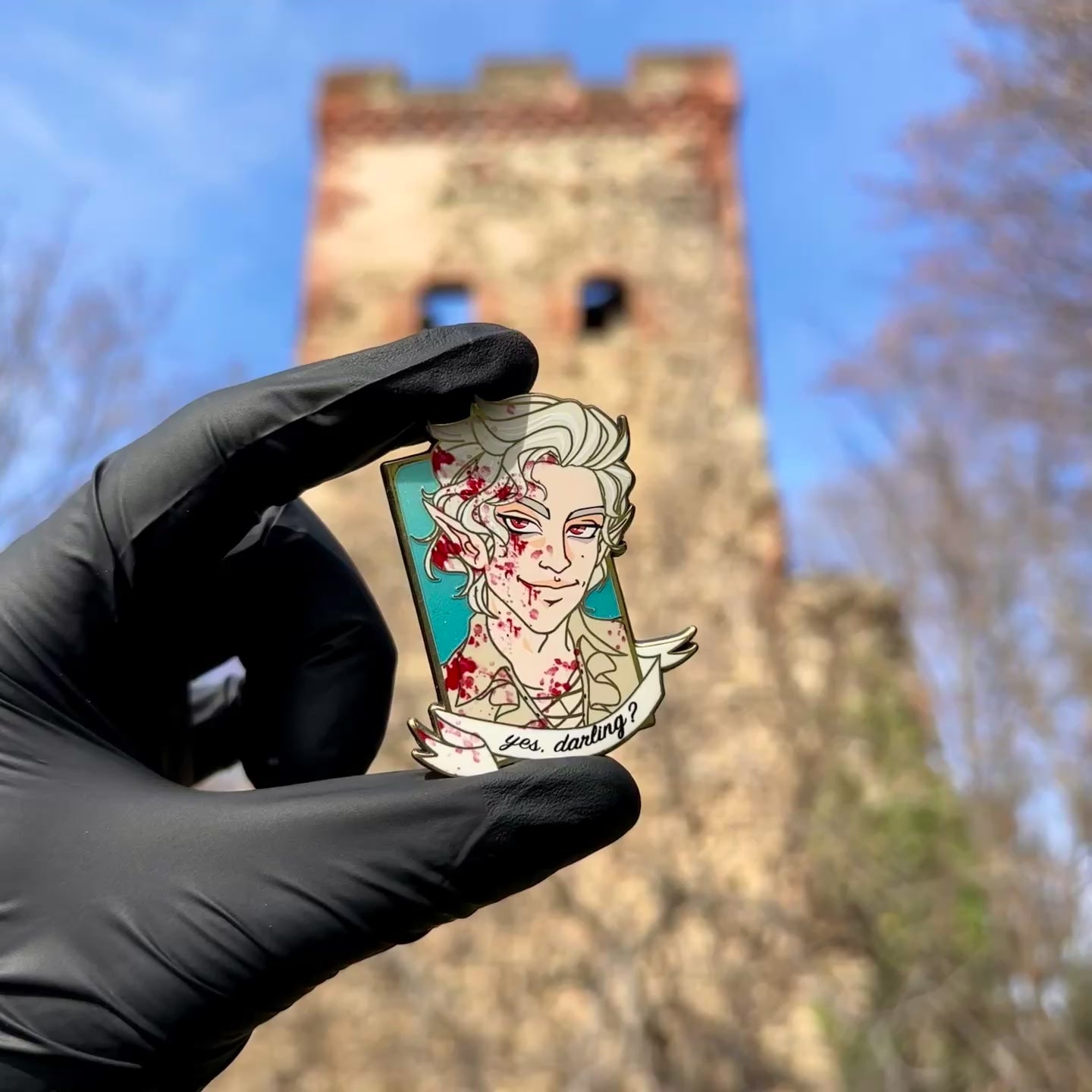 LE40, 2,36 inches (6 cm) tall antique golden plated pin with raised metal areas, gradient pearl and screenprint. LE20 bloody variants have additional UV print.