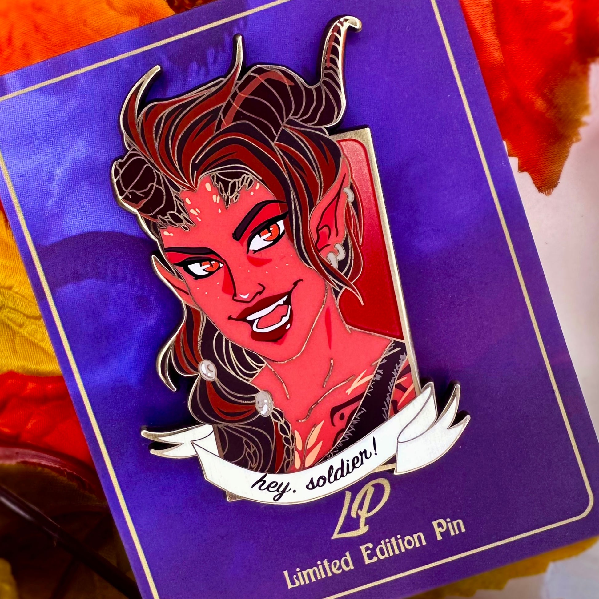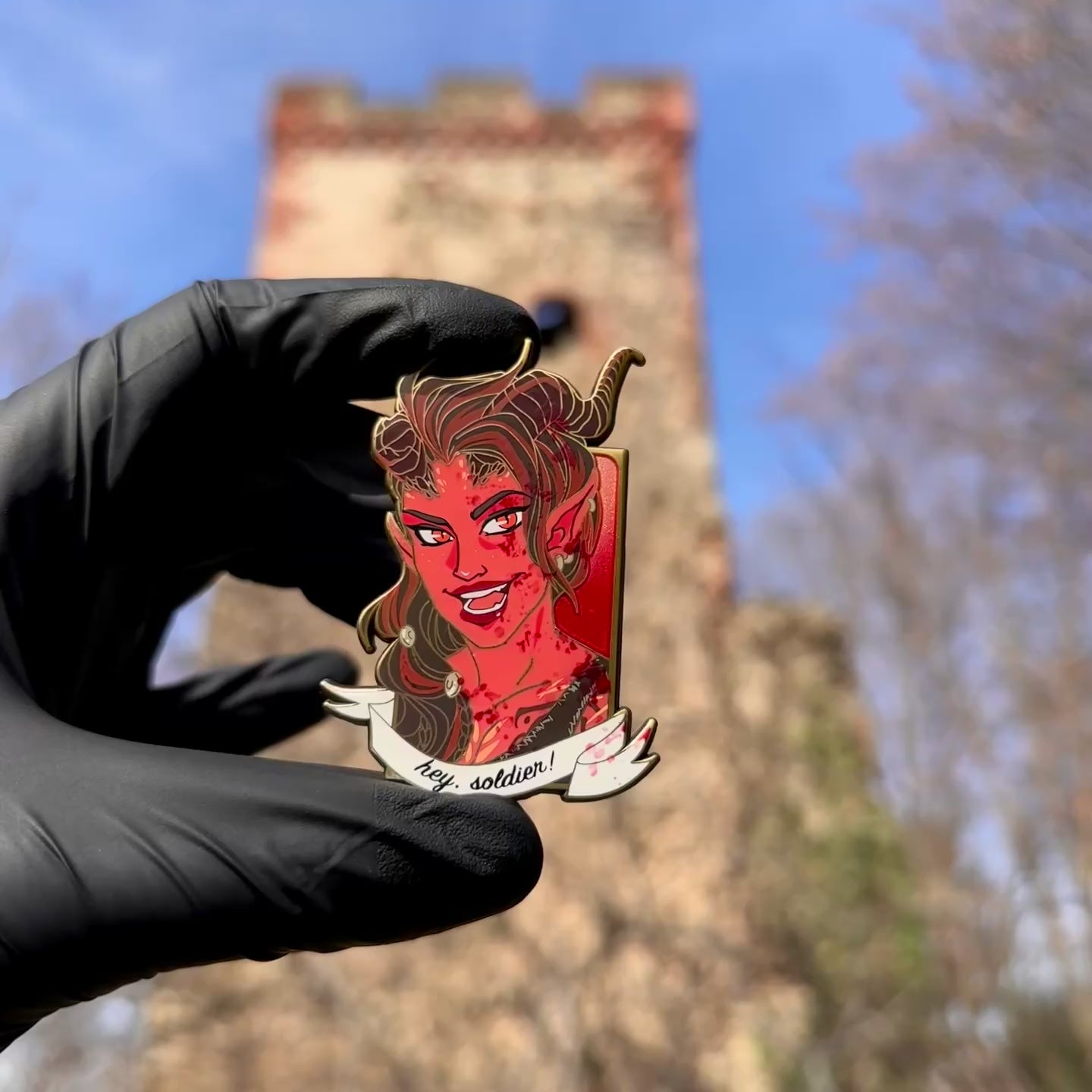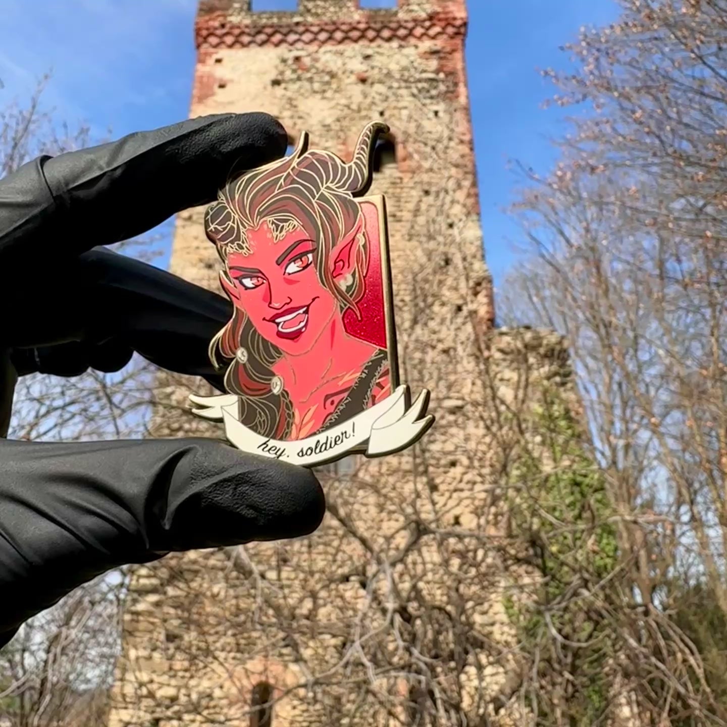 LE30, 2,5 inches (6 cm) tall antique golden plated pin with raised metal areas, gradient pearl and screenprint. LE10 bloody variants have additional UV print.