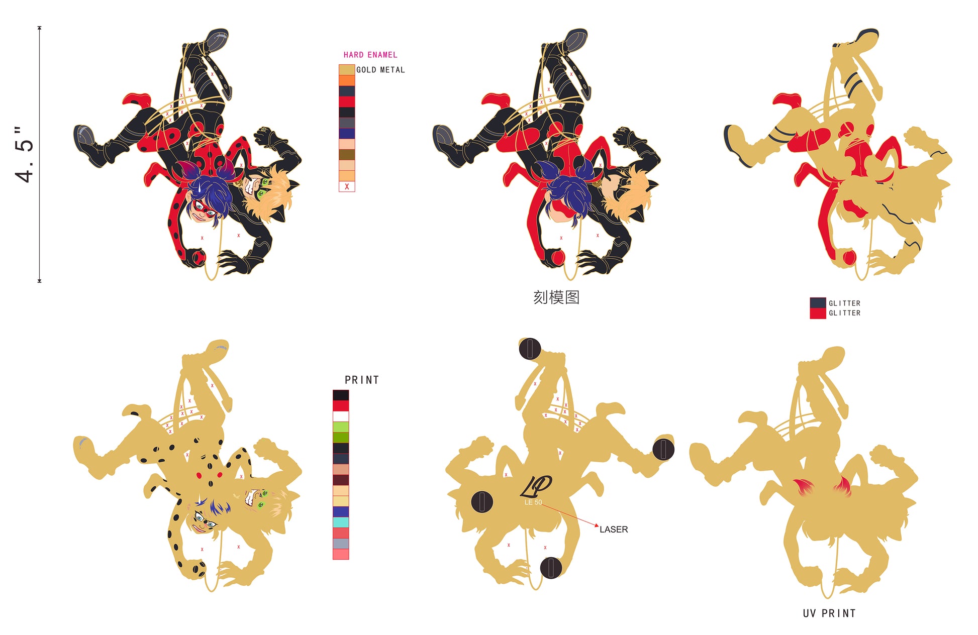 LE50, 4,5 inches (11,43 cm) tall golden plated pins with glitter, raised metal details, UV gradient print and screen-printed details.