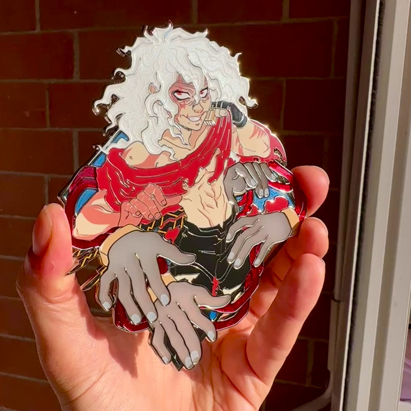 LE50, 5 inches (12,7 cm) tall nickel plated pin with several effects as: stainglass, sandblast, pearl no swirls, raised metal, UV print, screenprint.