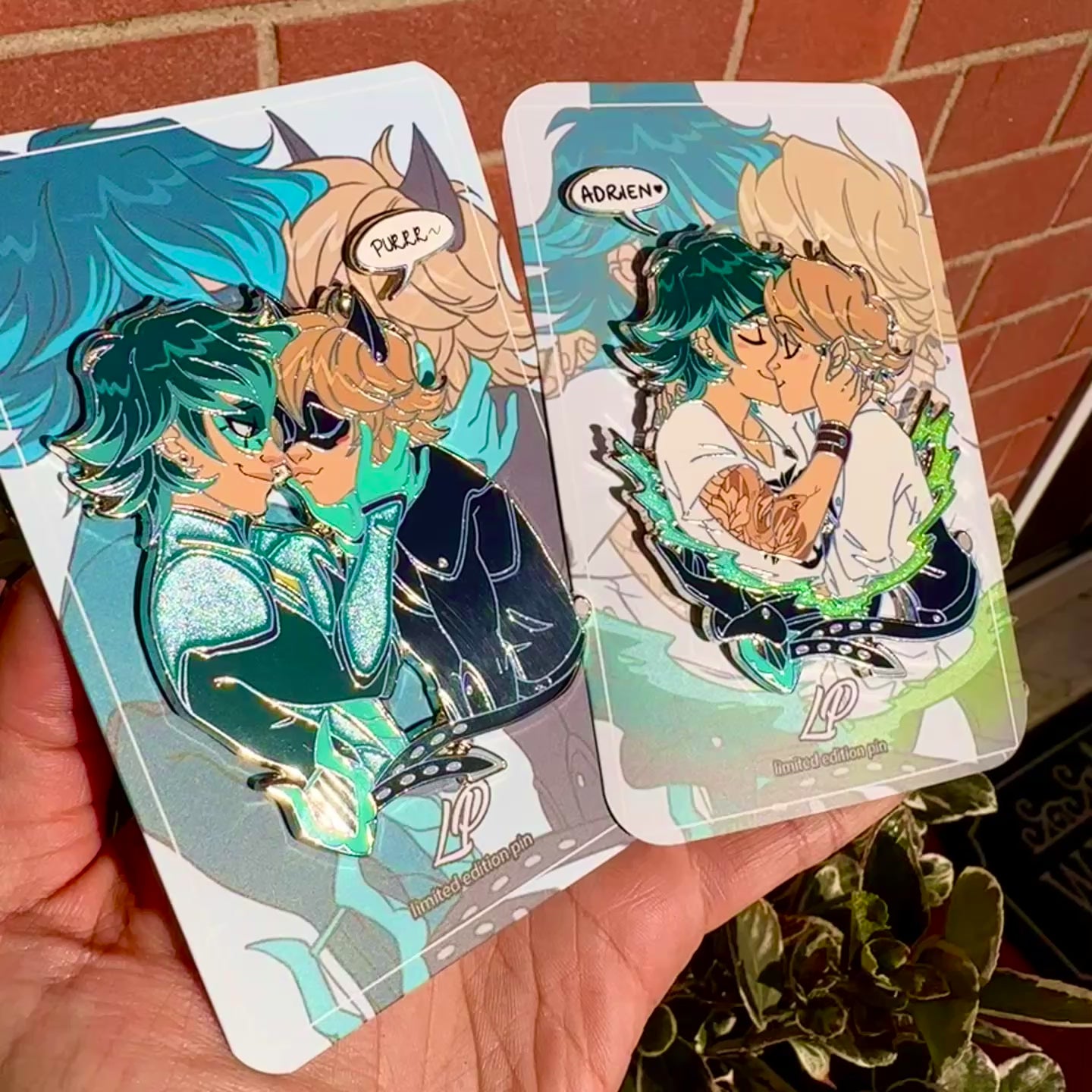 LE50, 3 inches (7,62 cm) tall silver plated pin with pearl gradient effect and screen-printed details. The additional speech bubble pin is 0,65 inches wide with screenprint (included in the pin set).